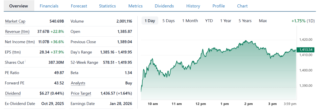 Bernstein raised its price target to $1,642 from $1,528. Berenberg Bank maintained its “buy” rating on January 23. However, Banco Santander downgraded the stock to “sell” on January 22. The consensus analyst estimate stands at $1,420, suggesting 4.54% upside potential.