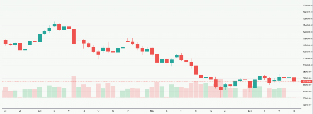 $90,000 had become a psychological pivot by mid-December. The next clear support zones lie near $85,000 and $77,000, based on recent swing lows and horizontal price clusters. Immediate resistance sits around $93,000-$95,000.