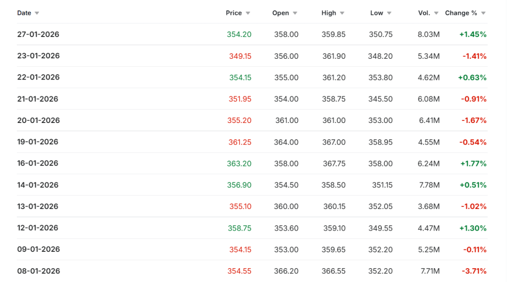 The stock opened at Rs 356.00 on January 23, 2026. It touched a day’s high of Rs 361.90. The closing price stood at Rs 349.70. This represents a decline of Rs 4.45 or 1.26% from the previous session.