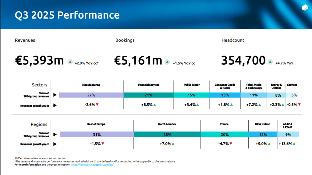 Capgemini’s Q3 strength came from a mix of services: AI, digital transformation, cloud modernization, and consulting. These areas saw higher client budgets, especially for projects tied to automation and large-scale AI pilots.