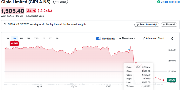 The Cipla share traded around the ₹1,500-₹1,580 band in late October 2025. Recent intraday swings moved the stock from roughly ₹1,590 down to about ₹1,510 on October 30–31, 2025. These moves followed the company’s quarterly update and some broader market weakness in mid- to late-October.