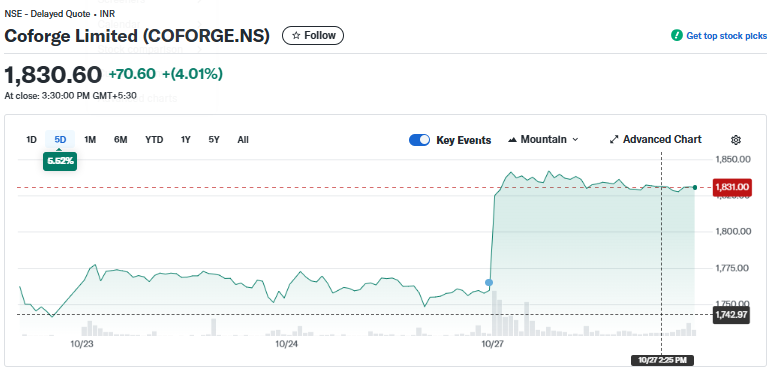The Coforge share price jumped about 5-6% on 27 October 2025 after brokers raised price targets. The stock hit an intraday high near ₹1,866 as investors reacted to the company’s quarterly numbers.