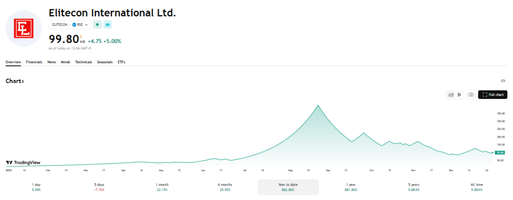 The year 2025 has been extraordinary for Elitecon International. Over the past 12 months, the stock rallied about 850%, transforming from a low-priced counter into a headline performer among small caps. Since its listing in August 2024, some reports have even put long-term returns as high as 7,500%, underscoring the dramatic rise over time.