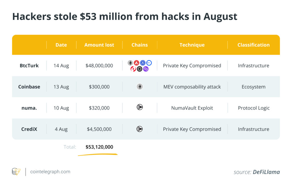 Cybercriminals stole $53 million from DeFi exploits in August, highlighting persistent security vulnerabilities. The Radiant Capital hack exemplified sophisticated attack methods, with hackers subsequently doubling their gains through strategic Ethereum trading.