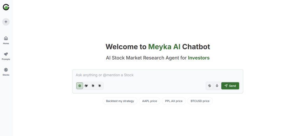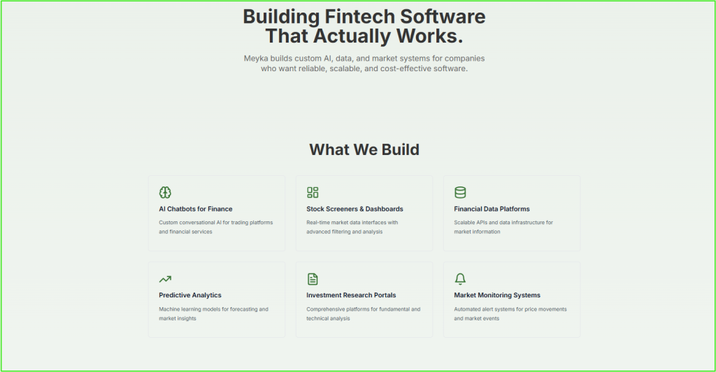 Meyka offers data transparency, custom enterprise integrations, and an advanced AI chatbot interface, Meyka Chat, which helps financial analysts make smarter, faster decisions through conversational intelligence and natural language queries.