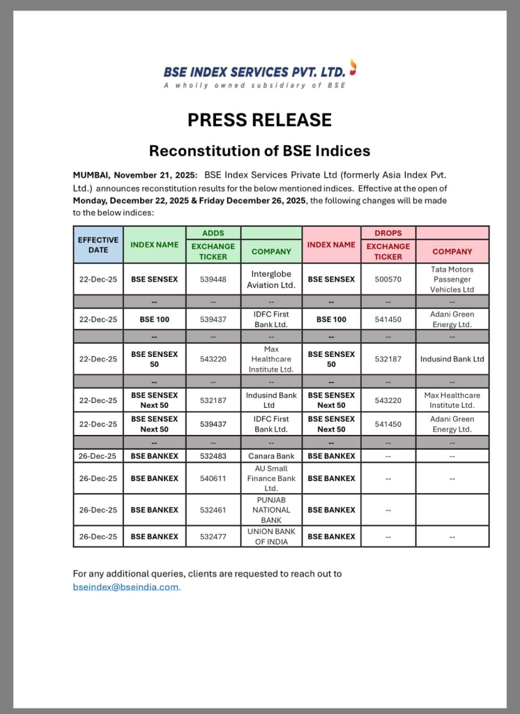 BSE Index Services announced a reconstitution of the Sensex in late November 2025. InterGlobe Aviation (IndiGo) will enter the 30-stock index. Tata Motors Passenger Vehicles (TMPV) will be removed. The reshuffle becomes effective at the market open on 22 December 2025. Index changes reflect market value, liquidity, and sector weight.