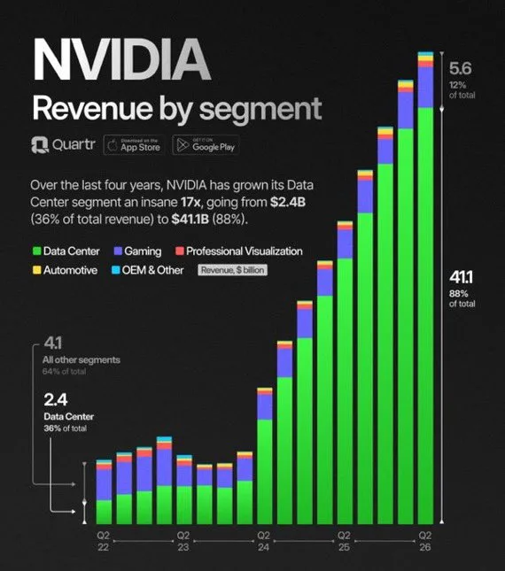 While Nvidia’s data center revenue dominates headlines, its other segments continue to play key roles. Gaming revenue contributed roughly $3.4 billion, professional visualization generated about $750 million, and automotive chips added another $1.2 billion.