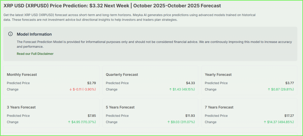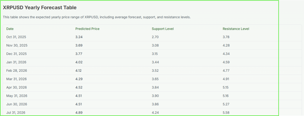 Proprietary forecasting platforms show a range of outcomes for XRP over the next year. Some models highlight bullish momentum and the chance of revisiting prior highs if ETF-related flows materialize.