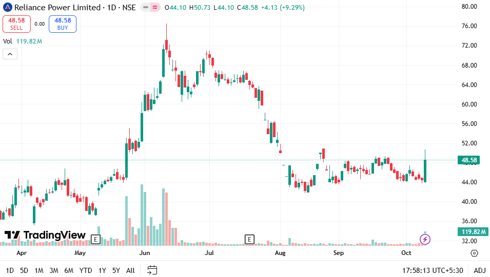 According to data from NSE India, the stock opened strong and quickly built momentum through the day, touching a session high above ₹50. The move follows weeks of consolidation, during which RPower hovered between ₹43 and ₹46, forming a strong base.