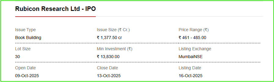 The Rubicon Research IPO is sized at about ₹1,375 crore, mixing a fresh issue and an offer for sale. The company fixed a price band of ₹461 to ₹485 per share. The issue window opens soon, and the shares are slated to list on the NSE and BSE once the allotment and listing process are completed.