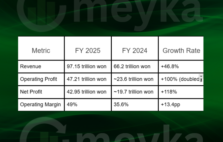 The full-year results significantly exceeded previous records set in 2024. Annual revenue increased by more than 30 trillion won. Operating profit nearly doubled year-over-year, marking the highest annual performance in company history. The 49% operating margin demonstrated exceptional profitability improvements. Net profit margin reached 44%, reflecting strong bottom-line conversion.