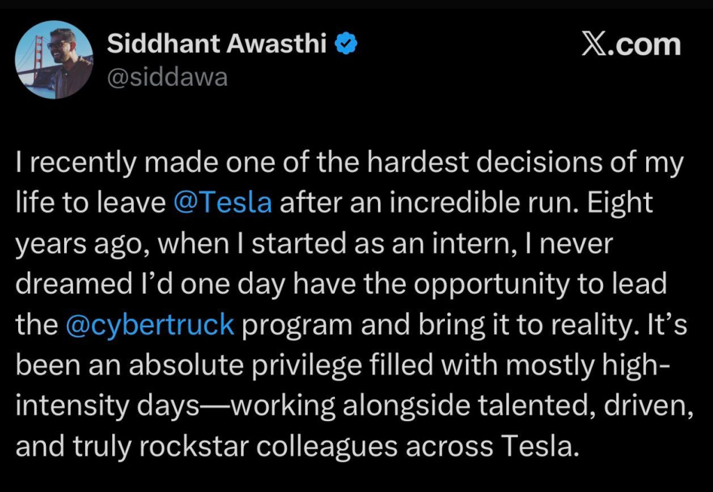 Tesla Cybertruck Program Head Siddhant Awasthi Leaves Company After 8 Years