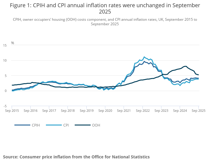 We are watching closely the latest numbers on UK inflation, which remained stuck at 3.8% for a third month in a row in September 2025. According to the Office for National Statistics (ONS), the headline Consumer Prices Index (CPI) rose by 3.8% over the 12 months to September, unchanged from August and July.