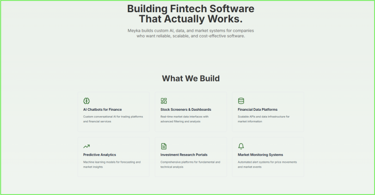 Explore Meyka’s enterprise services for tailored AI chatbot development and automation: https://meyka.com/contact-us/. In a world where AI is redefining financial intelligence, Meyka helps enterprises move faster, think smarter, and grow stronger.